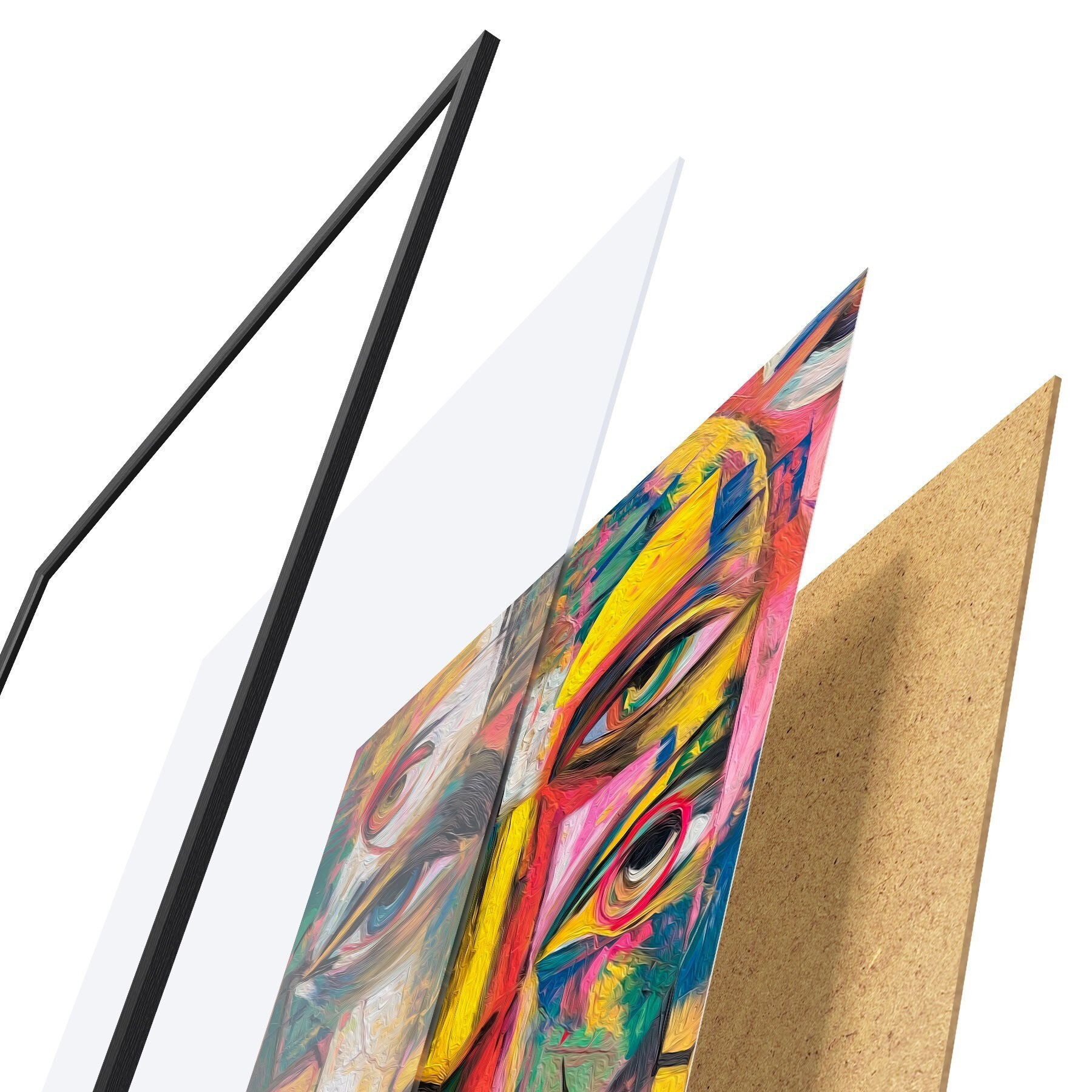 Plakát se skládá z rámu, plexiskla, tištěného obrazu a dřevotřískového podkladu. Díky úchytům na zadní straně lze plakát ihned zavěsit na zeď.