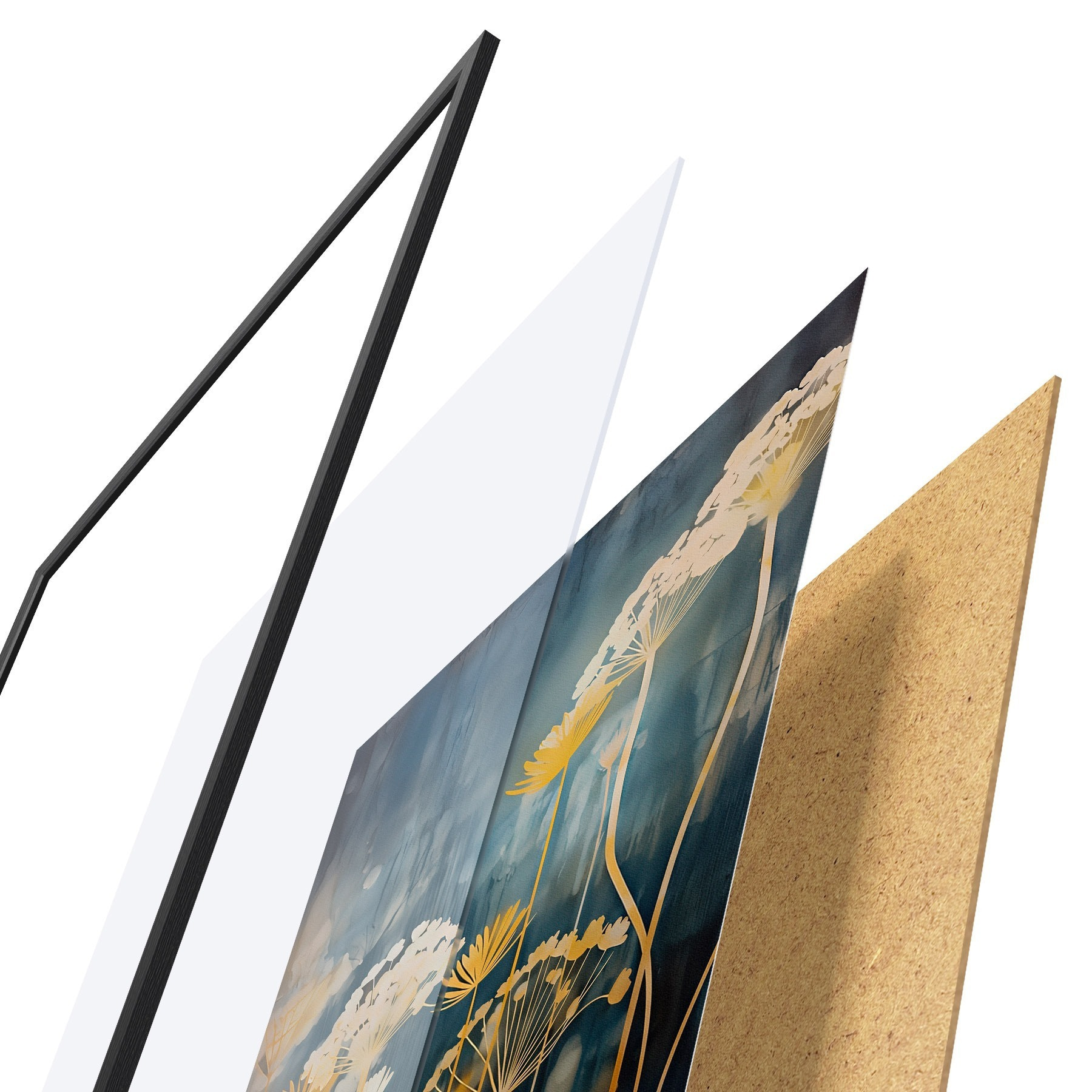 Plakát se skládá z rámu, plexiskla, tištěného obrazu a dřevotřískového podkladu. Díky úchytům na zadní straně lze plakát ihned zavěsit na zeď.