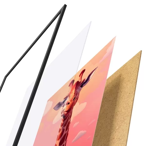 Plakát se skládá z rámu, plexiskla, tištěného obrazu a dřevotřískového podkladu. Díky úchytům na zadní straně lze plakát ihned zavěsit na zeď.