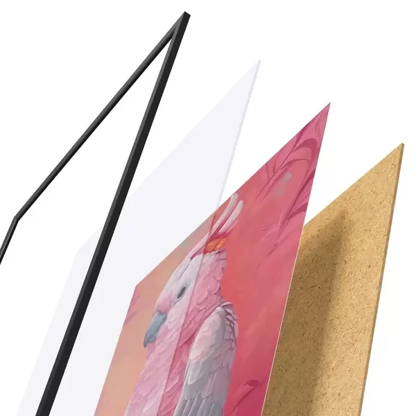 Plakát se skládá z rámu, plexiskla, tištěného obrazu a dřevotřískového podkladu. Díky úchytům na zadní straně lze plakát ihned zavěsit na zeď.