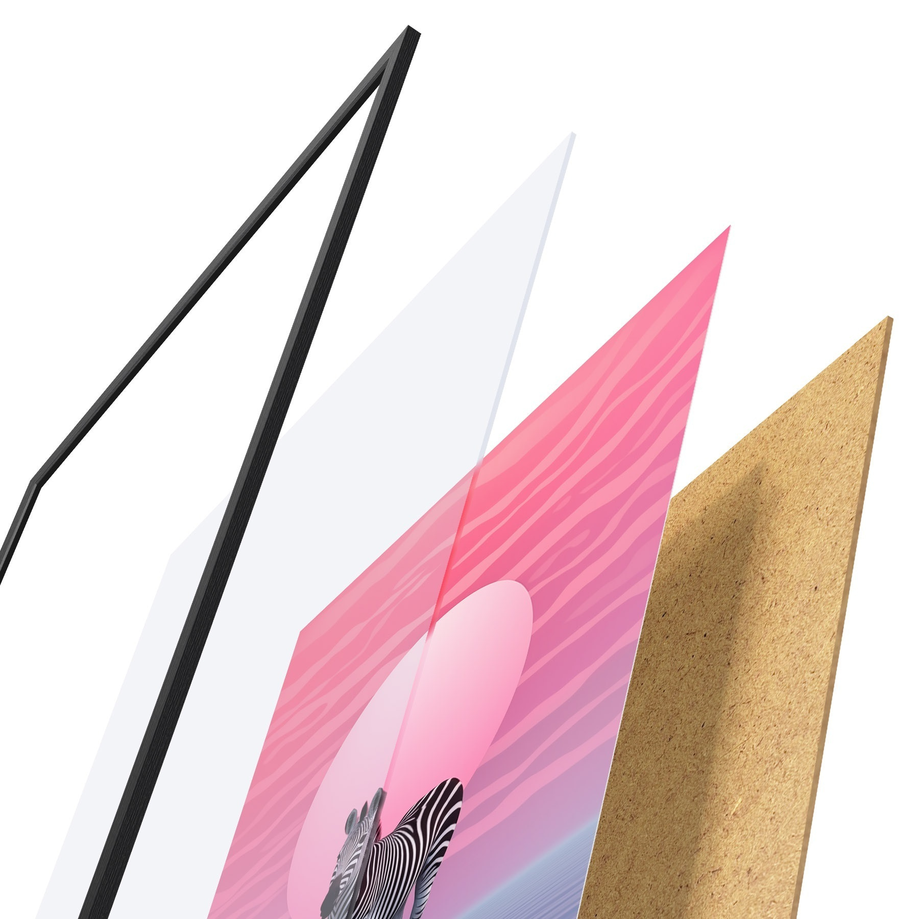 Plakát se skládá z rámu, plexiskla, tištěného obrazu a dřevotřískového podkladu. Díky úchytům na zadní straně lze plakát ihned zavěsit na zeď.
