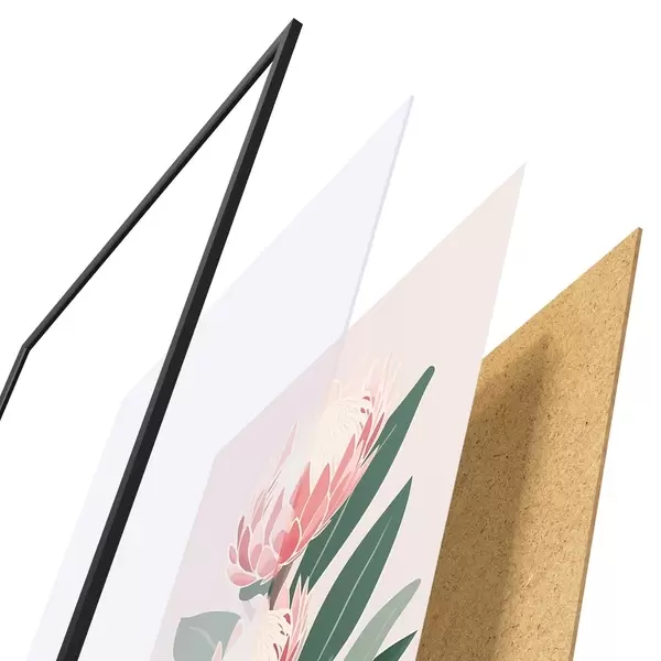 Plakát se skládá z rámu, plexiskla, tištěného obrazu a dřevotřískového podkladu. Díky úchytům na zadní straně lze plakát ihned zavěsit na zeď.