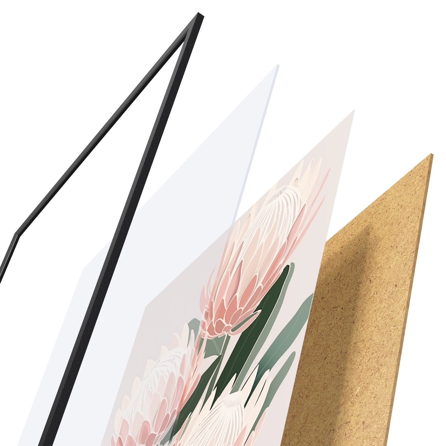 Plakát se skládá z rámu, plexiskla, tištěného obrazu a dřevotřískového podkladu. Díky úchytům na zadní straně lze plakát ihned zavěsit na zeď.