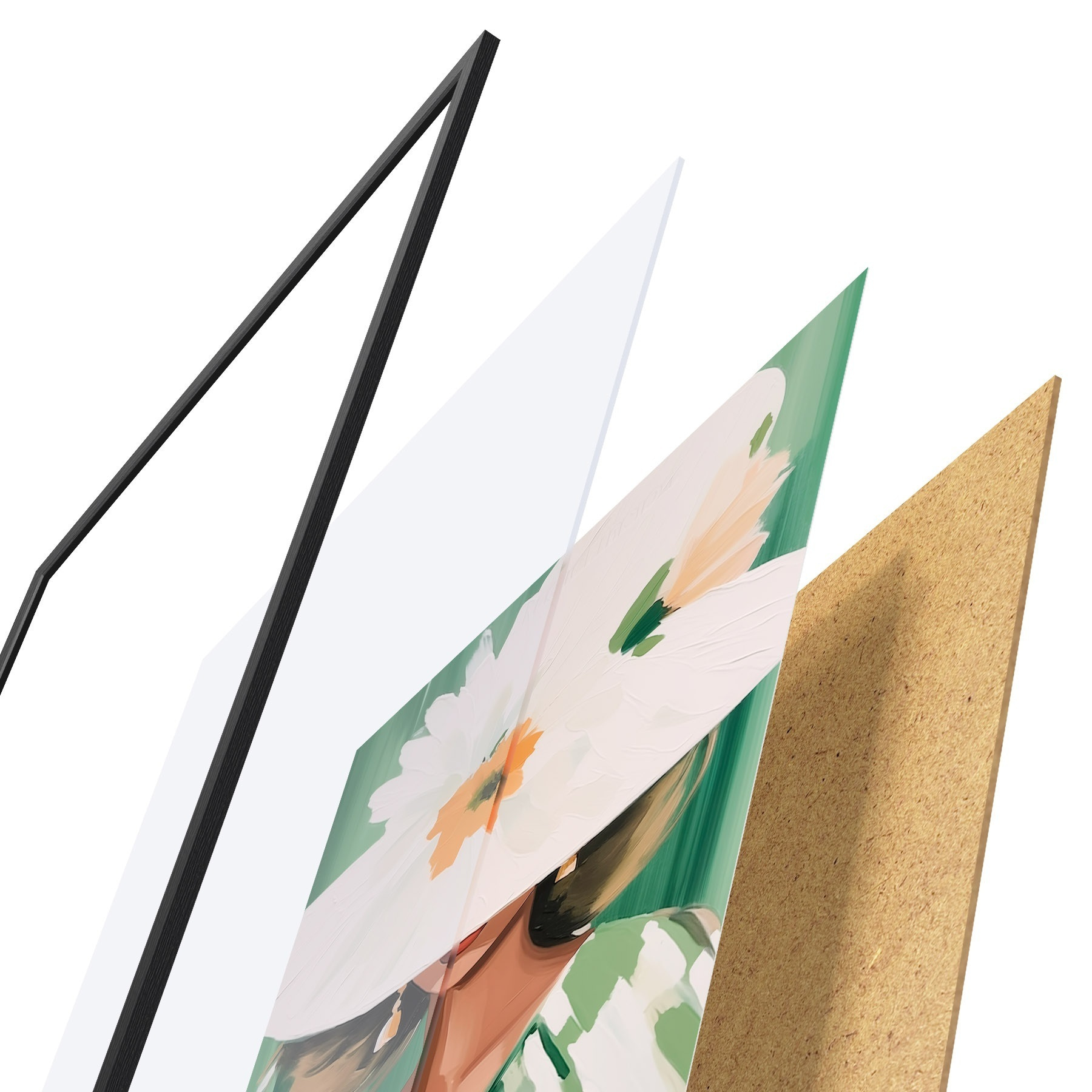 Plakát se skládá z rámu, plexiskla, tištěného obrazu a dřevotřískového podkladu. Díky úchytům na zadní straně lze plakát ihned zavěsit na zeď.