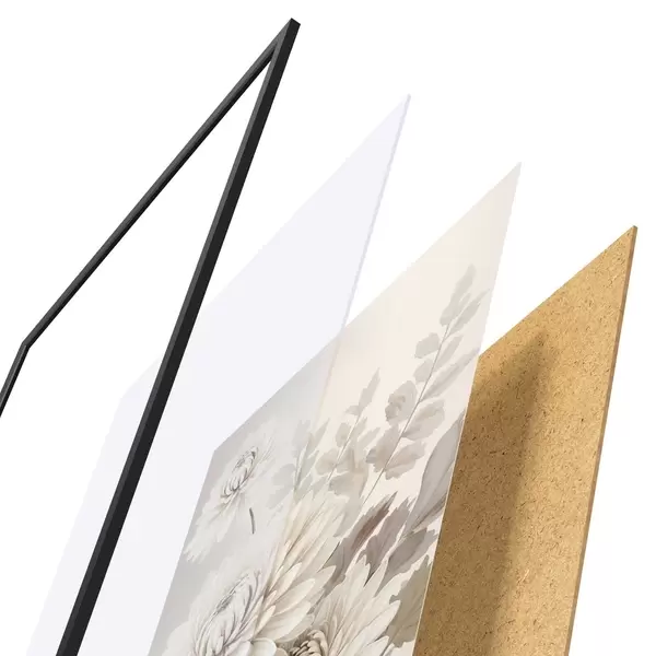 Plakát se skládá z rámu, plexiskla, tištěného obrazu a dřevotřískového podkladu. Díky úchytům na zadní straně lze plakát ihned zavěsit na zeď.