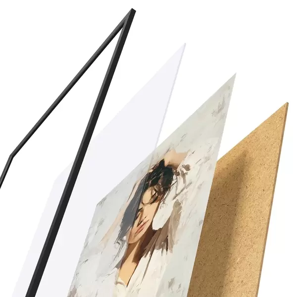 Plakát se skládá z rámu, plexiskla, tištěného obrazu a dřevotřískového podkladu. Díky úchytům na zadní straně lze plakát ihned zavěsit na zeď.