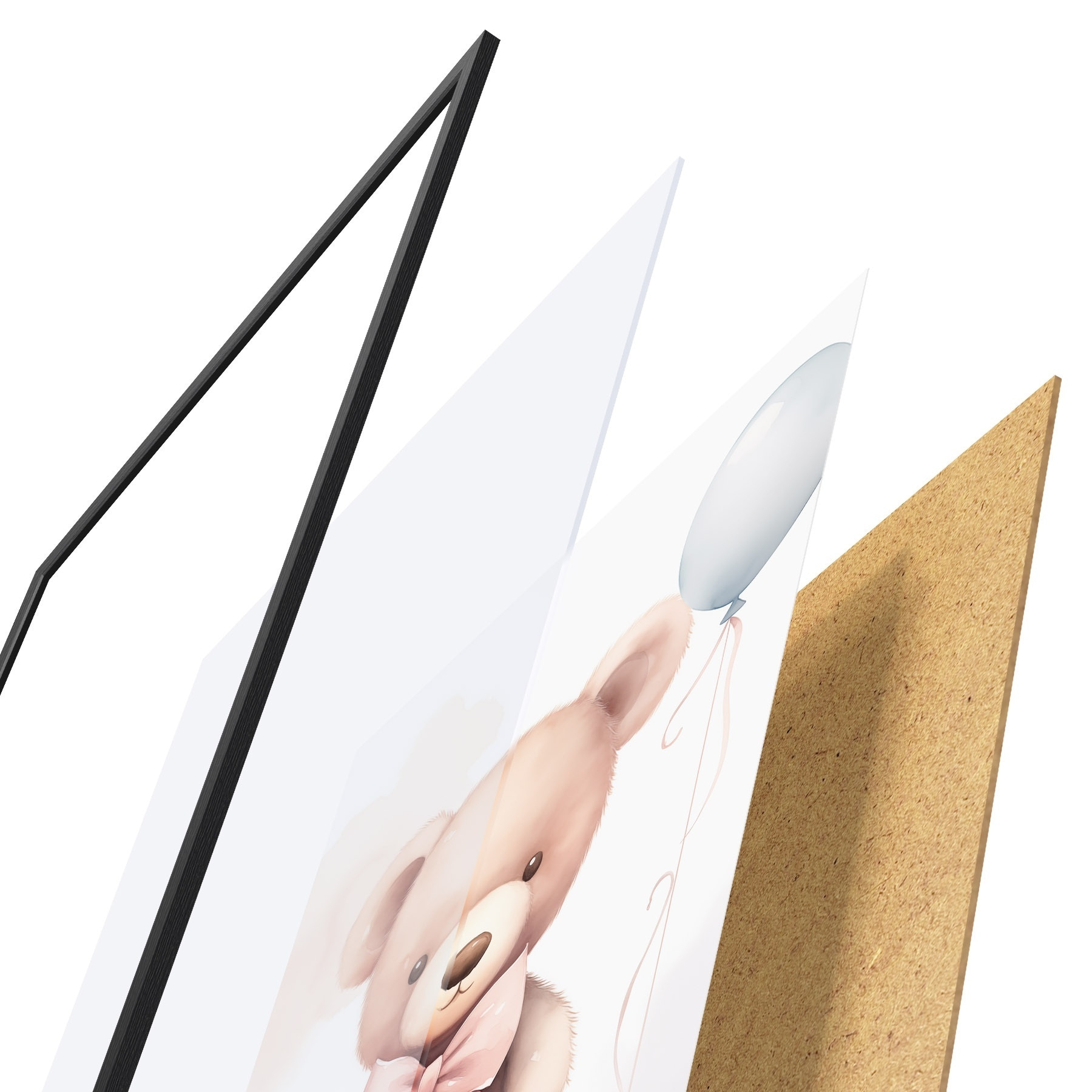 Plakát se skládá z rámu, plexiskla, tištěného obrazu a dřevotřískového podkladu. Díky úchytům na zadní straně lze plakát ihned zavěsit na zeď.
