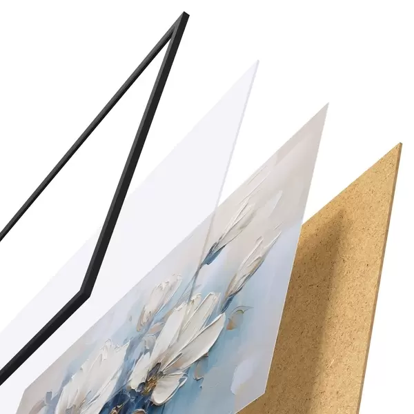 Plakát se skládá z rámu, plexiskla, tištěného obrazu a dřevotřískového podkladu. Díky úchytům na zadní straně lze plakát ihned zavěsit na zeď.