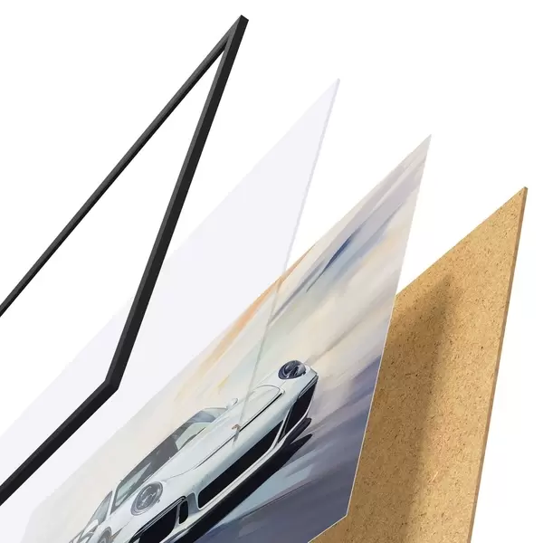 Plakát se skládá z rámu, plexiskla, tištěného obrazu a dřevotřískového podkladu. Díky úchytům na zadní straně lze plakát ihned zavěsit na zeď.