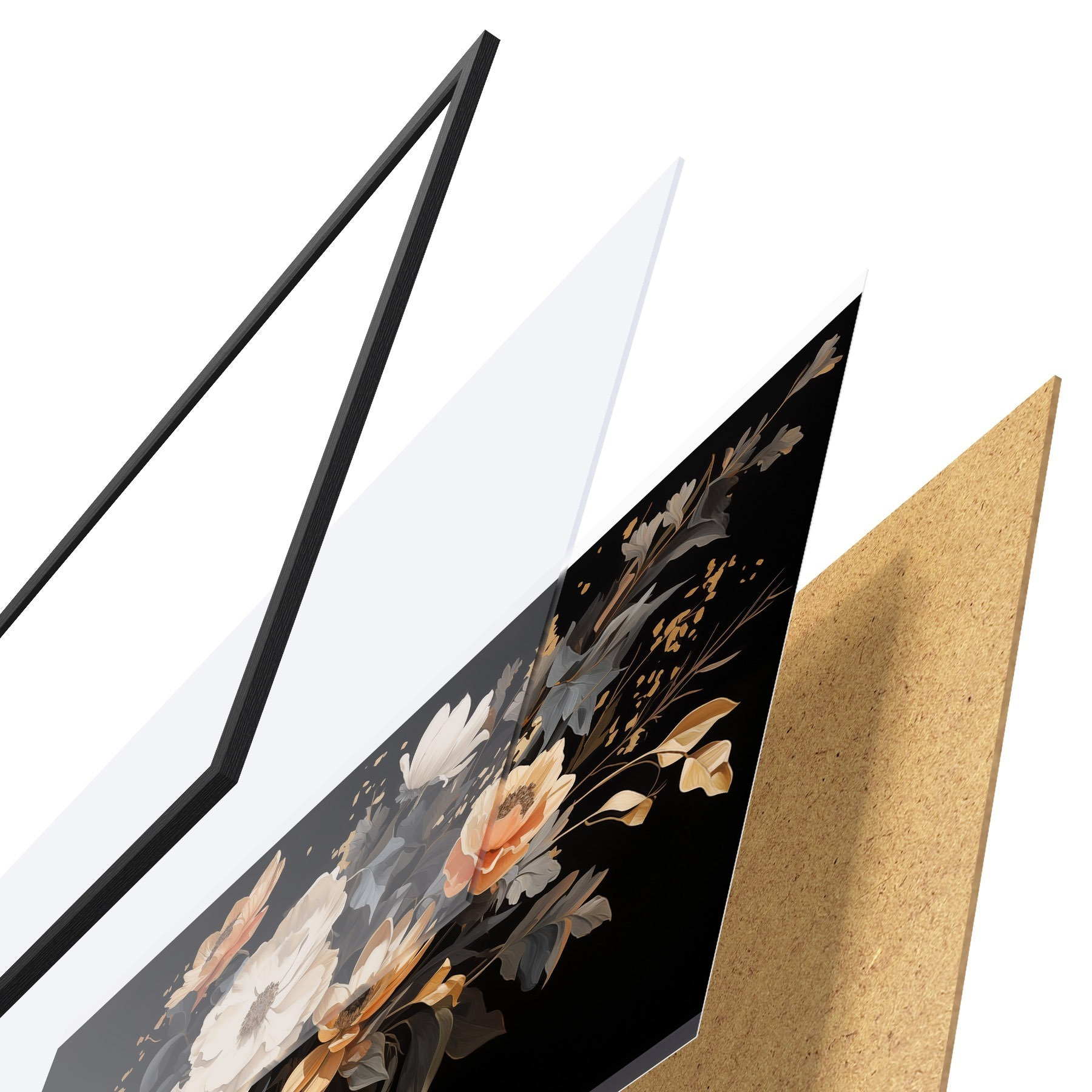 Plakát se skládá z rámu, plexiskla, tištěného obrazu a dřevotřískového podkladu. Díky úchytům na zadní straně lze plakát ihned zavěsit na zeď.