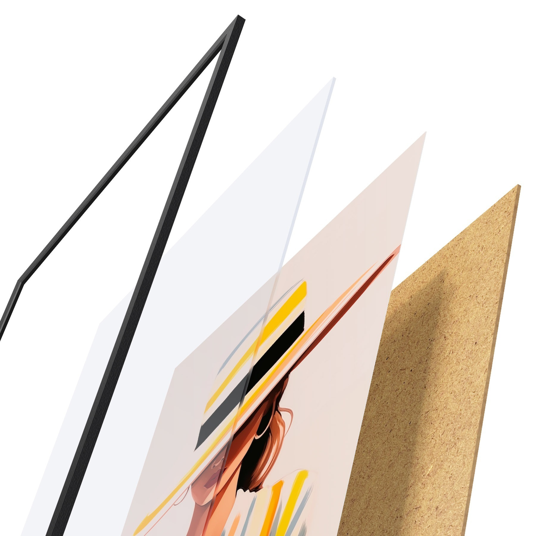 Plakát se skládá z rámu, plexiskla, tištěného obrazu a dřevotřískového podkladu. Díky úchytům na zadní straně lze plakát ihned zavěsit na zeď.
