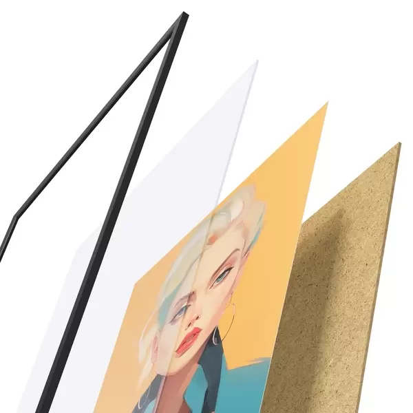 Plakát se skládá z rámu, plexiskla, tištěného obrazu a dřevotřískového podkladu. Díky úchytům na zadní straně lze plakát ihned zavěsit na zeď.