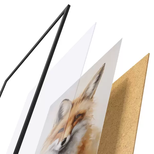 Plakát se skládá z rámu, plexiskla, tištěného obrazu a dřevotřískového podkladu. Díky úchytům na zadní straně lze plakát ihned zavěsit na zeď.