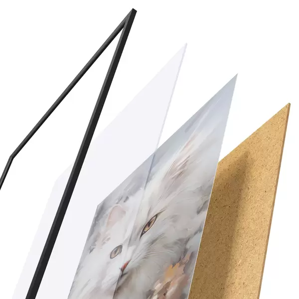 Plakát se skládá z rámu, plexiskla, tištěného obrazu a dřevotřískového podkladu. Díky úchytům na zadní straně lze plakát ihned zavěsit na zeď.