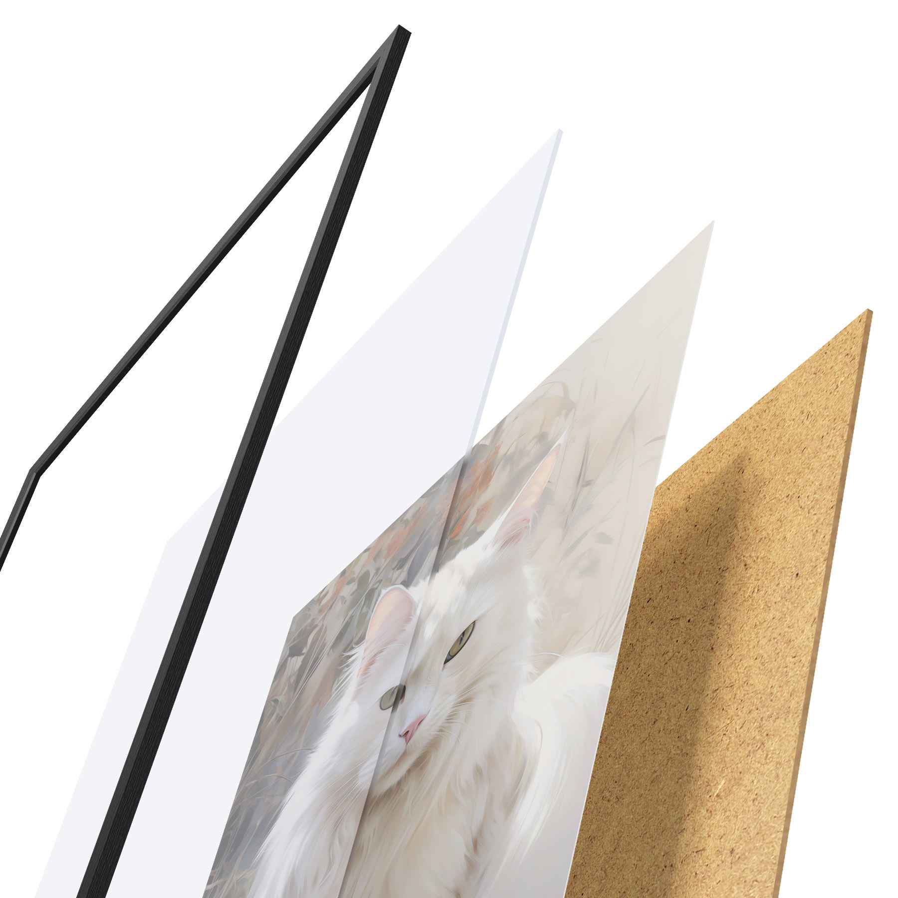 Plakát se skládá z rámu, plexiskla, tištěného obrazu a dřevotřískového podkladu. Díky úchytům na zadní straně lze plakát ihned zavěsit na zeď.