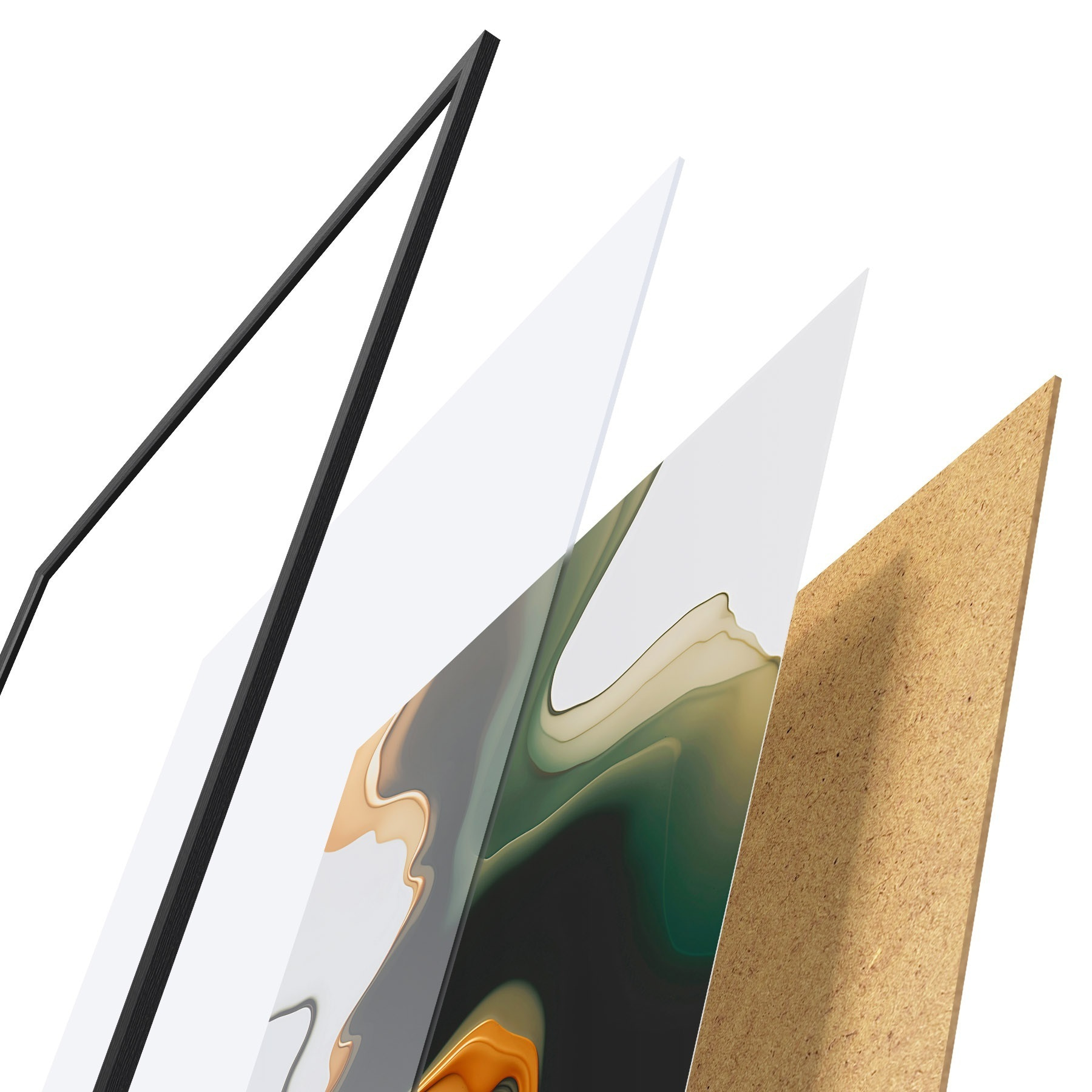 Plakát se skládá z rámu, plexiskla, tištěného obrazu a dřevotřískového podkladu. Díky úchytům na zadní straně lze plakát ihned zavěsit na zeď.