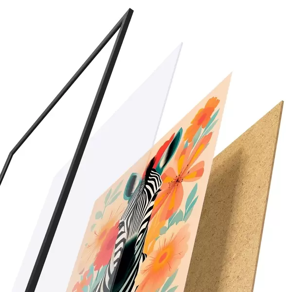 Plakát se skládá z rámu, plexiskla, tištěného obrazu a dřevotřískového podkladu. Díky úchytům na zadní straně lze plakát ihned zavěsit na zeď.