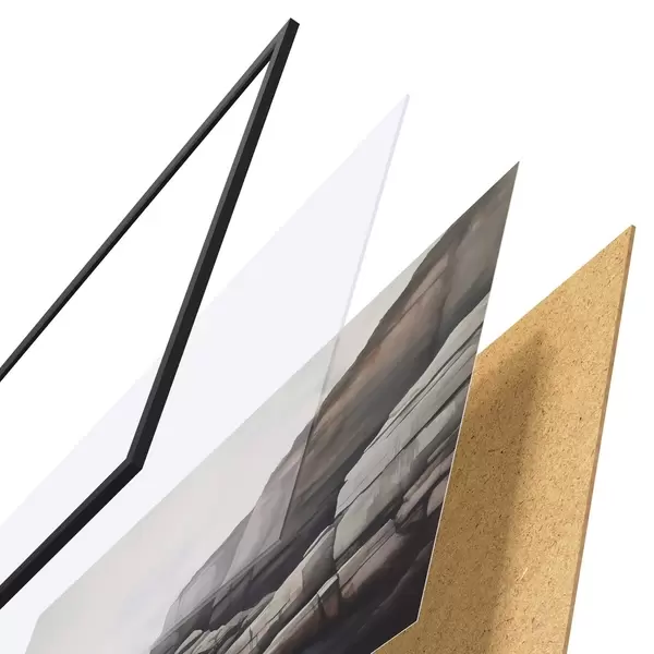 Plakát se skládá z rámu, plexiskla, tištěného obrazu a dřevotřískového podkladu. Díky úchytům na zadní straně lze plakát ihned zavěsit na zeď.