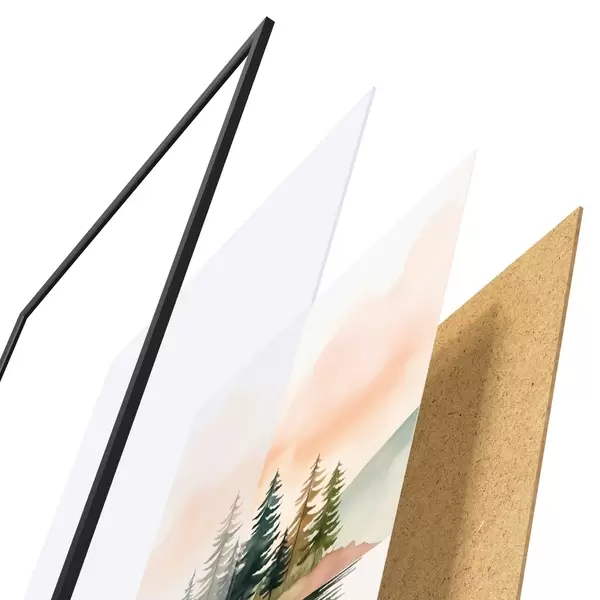 Plakát se skládá z rámu, plexiskla, tištěného obrazu a dřevotřískového podkladu. Díky úchytům na zadní straně lze plakát ihned zavěsit na zeď.
