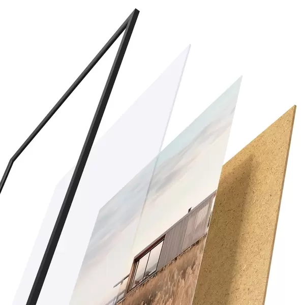 Plakát se skládá z rámu, plexiskla, tištěného obrazu a dřevotřískového podkladu. Díky úchytům na zadní straně lze plakát ihned zavěsit na zeď.