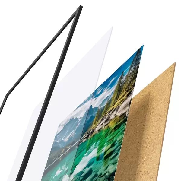 Plakát se skládá z rámu, plexiskla, tištěného obrazu a dřevotřískového podkladu. Díky úchytům na zadní straně lze plakát ihned zavěsit na zeď.