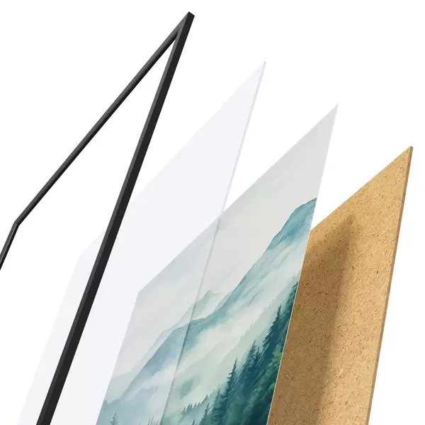 Plakát se skládá z rámu, plexiskla, tištěného obrazu a dřevotřískového podkladu. Díky úchytům na zadní straně lze plakát ihned zavěsit na zeď.