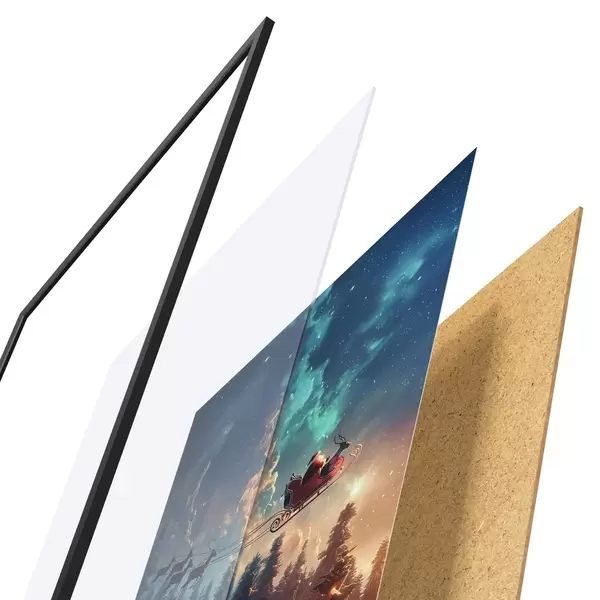 Plakát se skládá z rámu, plexiskla, tištěného obrazu a dřevotřískového podkladu. Díky úchytům na zadní straně lze plakát ihned zavěsit na zeď.