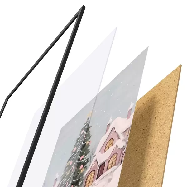 Plakát se skládá z rámu, plexiskla, tištěného obrazu a dřevotřískového podkladu. Díky úchytům na zadní straně lze plakát ihned zavěsit na zeď.
