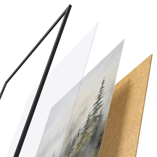 Plakát se skládá z rámu, plexiskla, tištěného obrazu a dřevotřískového podkladu. Díky úchytům na zadní straně lze plakát ihned zavěsit na zeď.