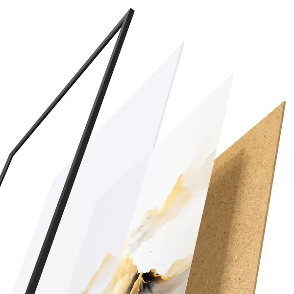 Plakát se skládá z rámu, plexiskla, tištěného obrazu a dřevotřískového podkladu. Díky úchytům na zadní straně lze plakát ihned zavěsit na zeď.