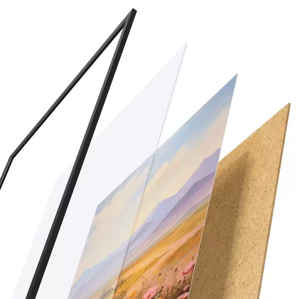 Plakát se skládá z rámu, plexiskla, tištěného obrazu a dřevotřískového podkladu. Díky úchytům na zadní straně lze plakát ihned zavěsit na zeď.