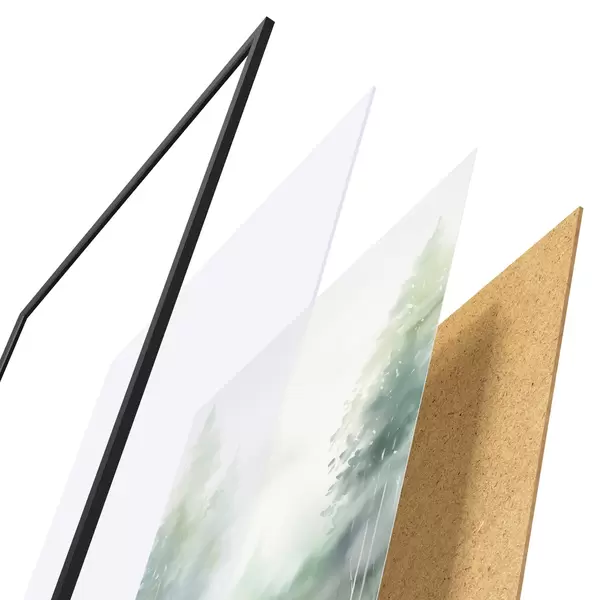 Plakát se skládá z rámu, plexiskla, tištěného obrazu a dřevotřískového podkladu. Díky úchytům na zadní straně lze plakát ihned zavěsit na zeď.