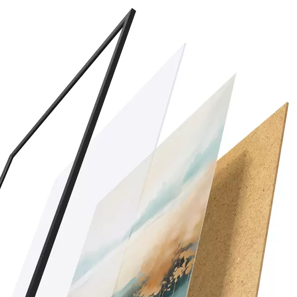 Plakát se skládá z rámu, plexiskla, tištěného obrazu a dřevotřískového podkladu. Díky úchytům na zadní straně lze plakát ihned zavěsit na zeď.