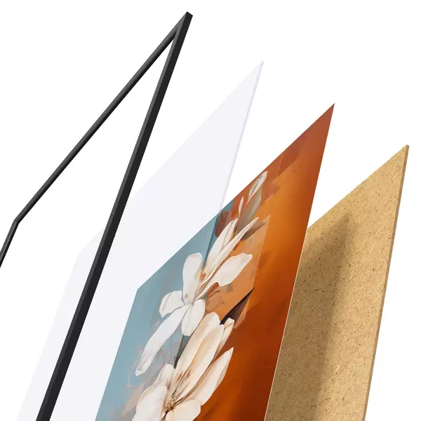 Plakát se skládá z rámu, plexiskla, tištěného obrazu a dřevotřískového podkladu. Díky úchytům na zadní straně lze plakát ihned zavěsit na zeď.