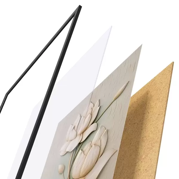 Plakát se skládá z rámu, plexiskla, tištěného obrazu a dřevotřískového podkladu. Díky úchytům na zadní straně lze plakát ihned zavěsit na zeď.