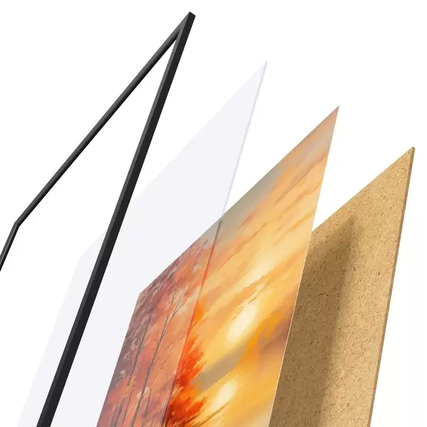 Plakát se skládá z rámu, plexiskla, tištěného obrazu a dřevotřískového podkladu. Díky úchytům na zadní straně lze plakát ihned zavěsit na zeď.