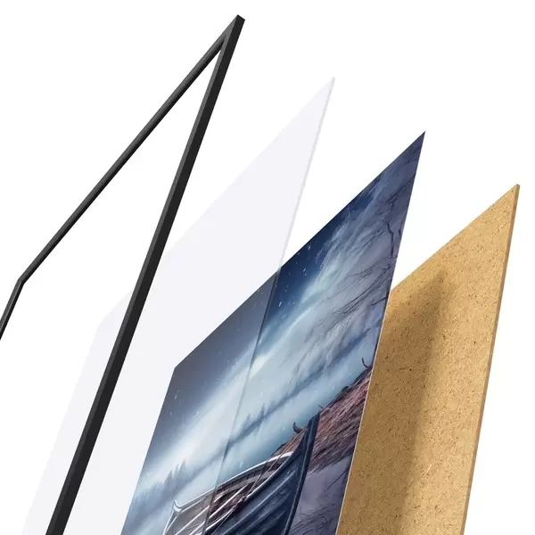 Plakát se skládá z rámu, plexiskla, tištěného obrazu a dřevotřískového podkladu. Díky úchytům na zadní straně lze plakát ihned zavěsit na zeď.