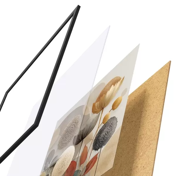 Plakát se skládá z rámu, plexiskla, tištěného obrazu a dřevotřískového podkladu. Díky úchytům na zadní straně lze plakát ihned zavěsit na zeď.