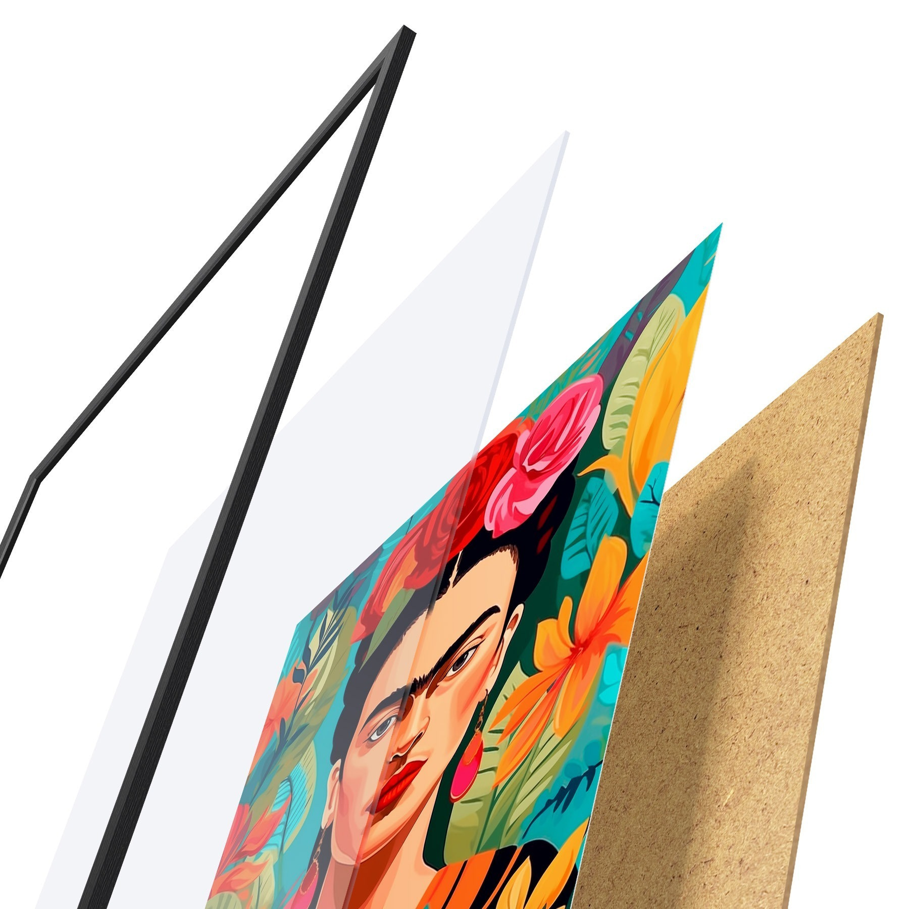 Plakát se skládá z rámu, plexiskla, tištěného obrazu a dřevotřískového podkladu. Díky úchytům na zadní straně lze plakát ihned zavěsit na zeď.