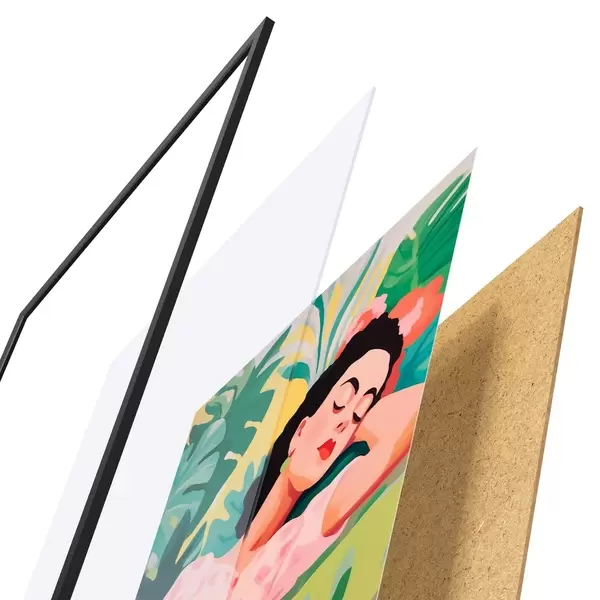 Plakát se skládá z rámu, plexiskla, tištěného obrazu a dřevotřískového podkladu. Díky úchytům na zadní straně lze plakát ihned zavěsit na zeď.