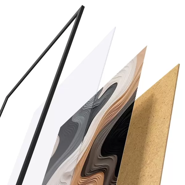 Plakát se skládá z rámu, plexiskla, tištěného obrazu a dřevotřískového podkladu. Díky úchytům na zadní straně lze plakát ihned zavěsit na zeď.