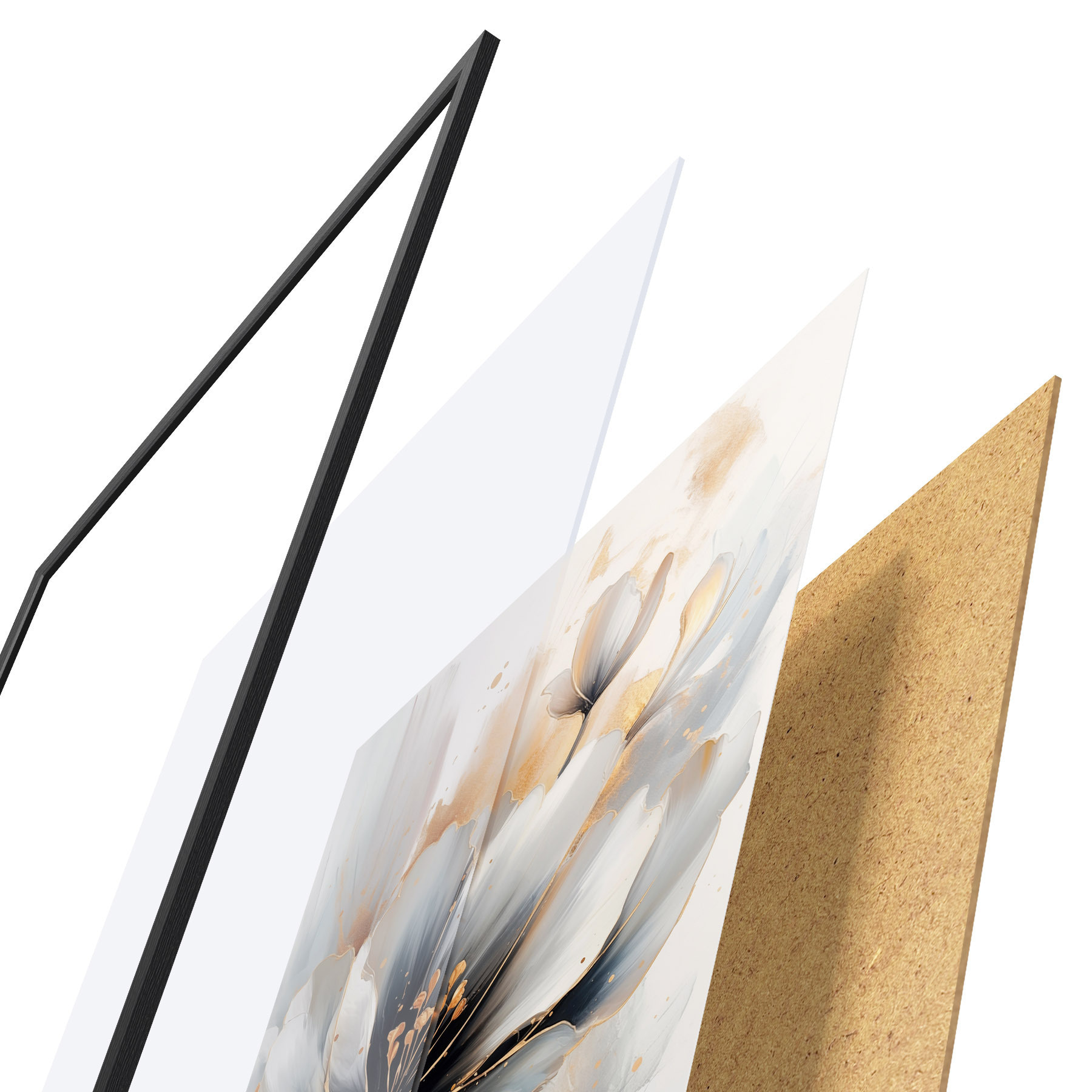 Plakát se skládá z rámu, plexiskla, tištěného obrazu a dřevotřískového podkladu. Díky úchytům na zadní straně lze plakát ihned zavěsit na zeď.
