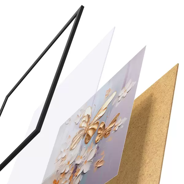 Plakát se skládá z rámu, plexiskla, tištěného obrazu a dřevotřískového podkladu. Díky úchytům na zadní straně lze plakát ihned zavěsit na zeď.