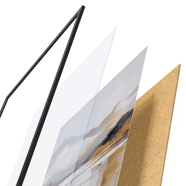 Plakát se skládá z rámu, plexiskla, tištěného obrazu a dřevotřískového podkladu. Díky úchytům na zadní straně lze plakát ihned zavěsit na zeď.