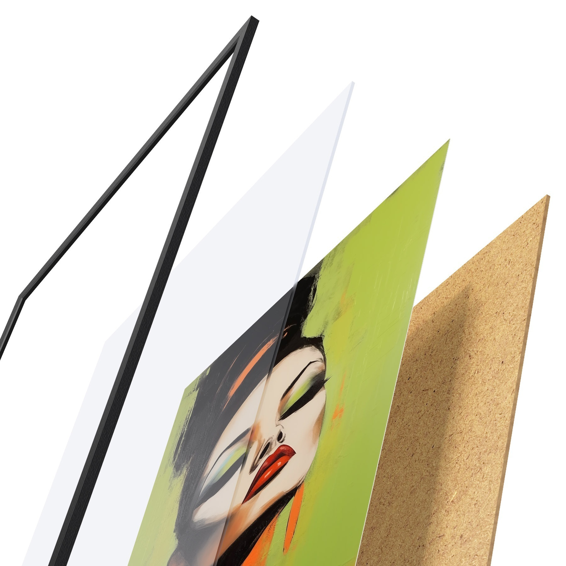 Plakát se skládá z rámu, plexiskla, tištěného obrazu a dřevotřískového podkladu. Díky úchytům na zadní straně lze plakát ihned zavěsit na zeď.