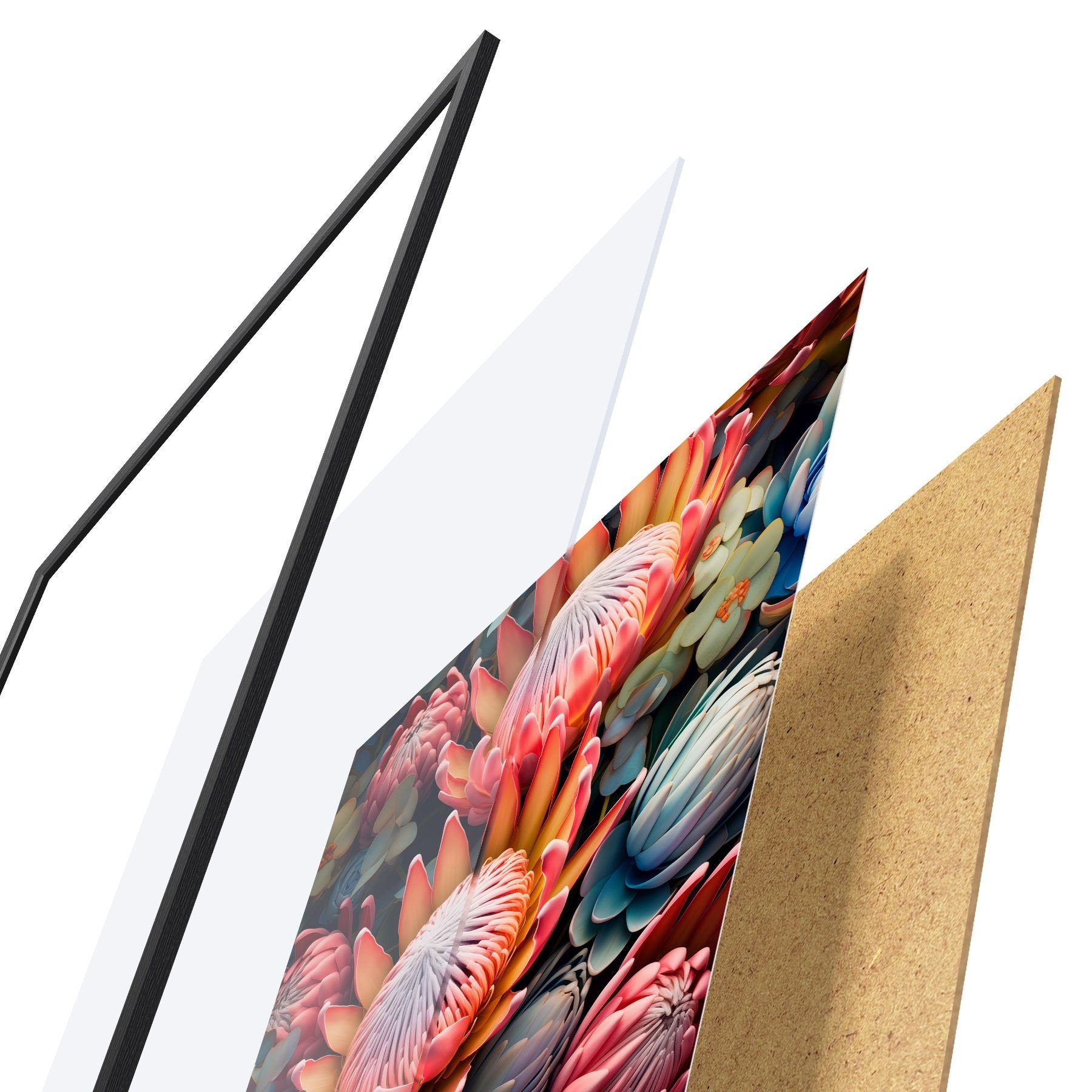 Plakát se skládá z rámu, plexiskla, tištěného obrazu a dřevotřískového podkladu. Díky úchytům na zadní straně lze plakát ihned zavěsit na zeď.