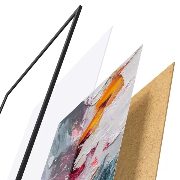Plakát se skládá z rámu, plexiskla, tištěného obrazu a dřevotřískového podkladu. Díky úchytům na zadní straně lze plakát ihned zavěsit na zeď.