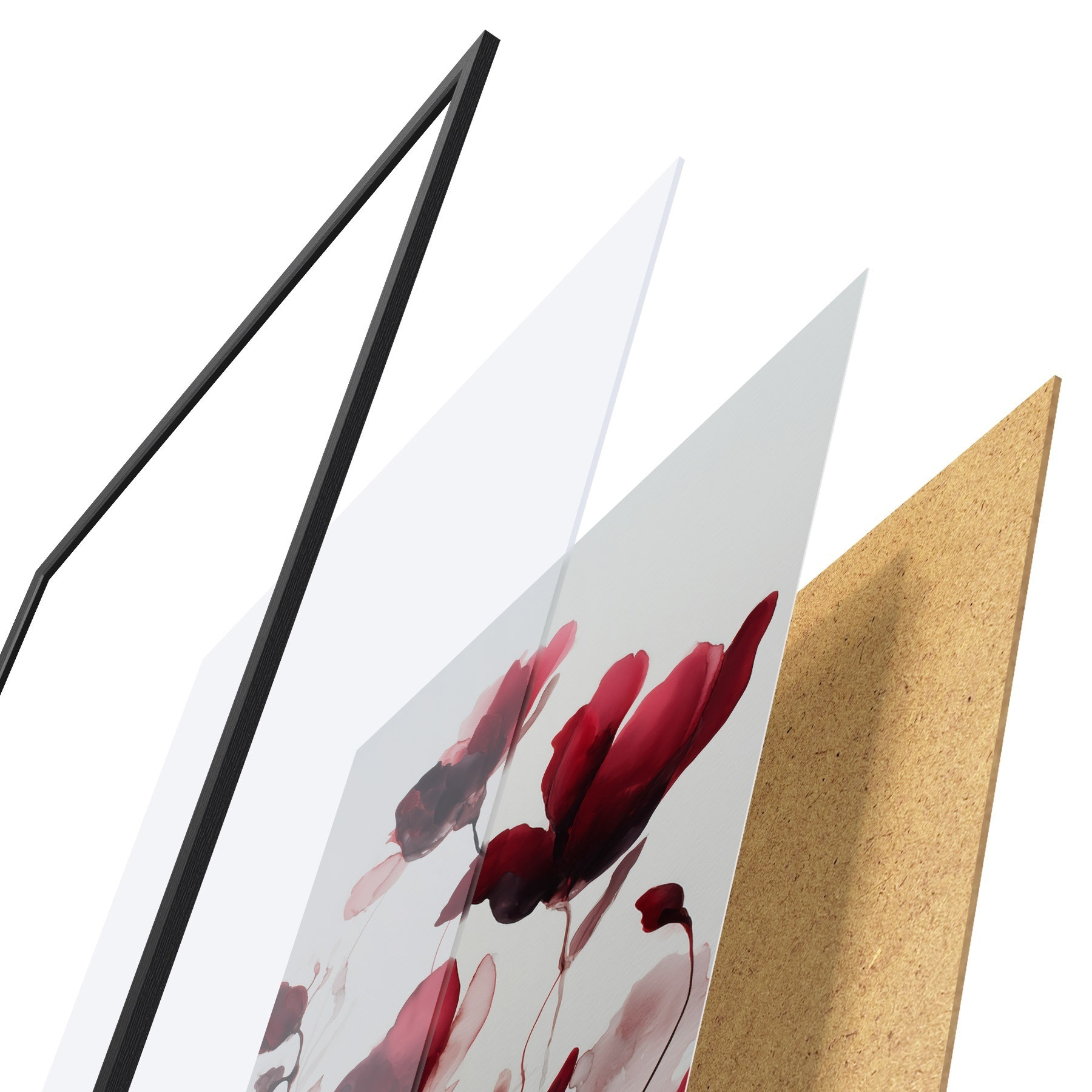 Plakát se skládá z rámu, plexiskla, tištěného obrazu a dřevotřískového podkladu. Díky úchytům na zadní straně lze plakát ihned zavěsit na zeď.