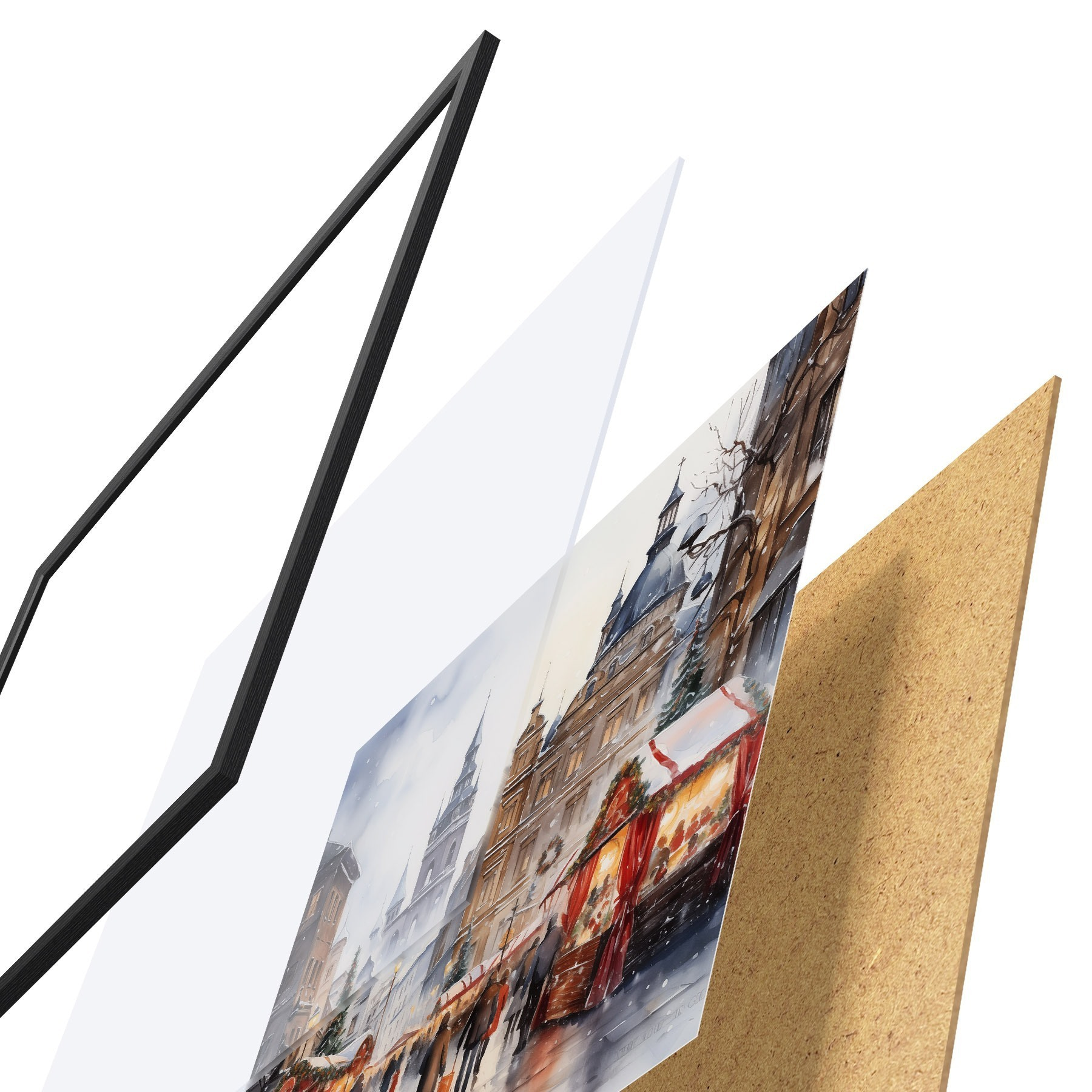 Plakát se skládá z rámu, plexiskla, tištěného obrazu a dřevotřískového podkladu. Díky úchytům na zadní straně lze plakát ihned zavěsit na zeď.