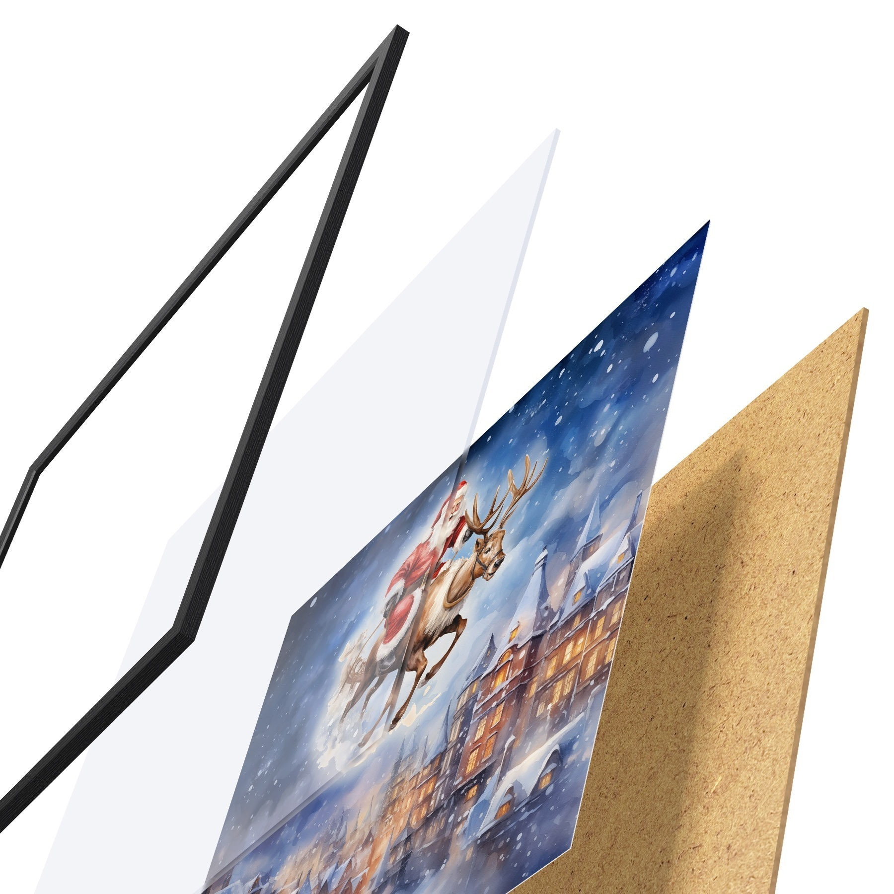 Plakát se skládá z rámu, plexiskla, tištěného obrazu a dřevotřískového podkladu. Díky úchytům na zadní straně lze plakát ihned zavěsit na zeď.